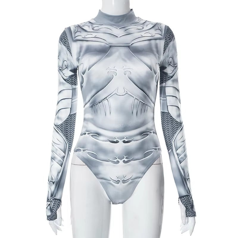 Crafted with high-quality, stretchy fabric for all-day comfort, the Cyberpunk Gothic Bodysuit fits like a second skin. The intricate gothic patterns on the bodysuit enhance its techwear vibes, while its long sleeves and high collar offer a touch of mystery and sophistication. 🖤