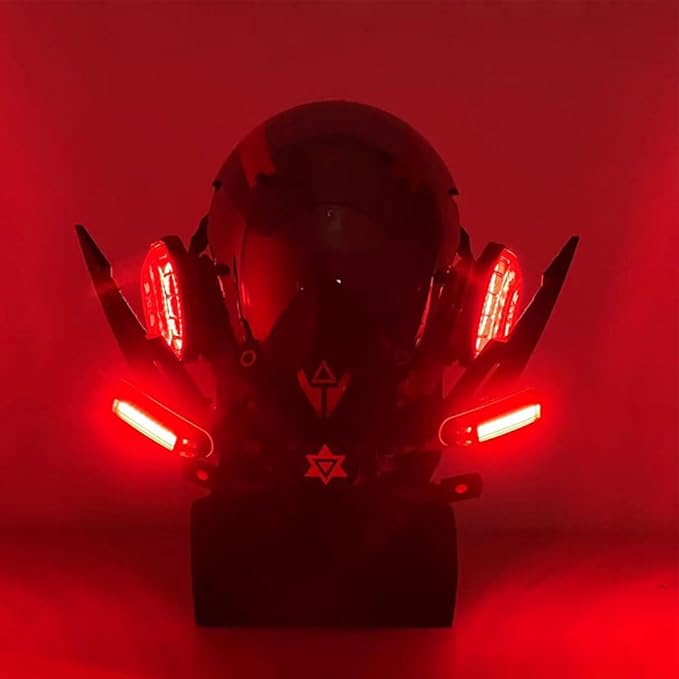 With its built-in LED lighting, the Red Tech Cyberpunk Helmet creates an undeniable glow that stands out in any crowd. Whether it’s for cosplay, Halloween, or a futuristic party, this mask will be your go-to piece to create the perfect vibe. Its handcrafted design ensures every detail is captured with precision, from geometric lines to metallic elements that scream high-tech rebellion.