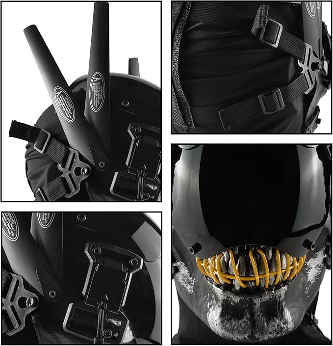 Step beyond reality and claim your edge. The Skull Cyber Punk Helmet is engineered to fuse dark street elegance with raw futuristic energy. Designed to disrupt and dominate, this cyberpunk mask is your new second skin. The Skull Cyber Punk Helmet features a skull-shaped mouth with integrated LED lighting—customizable to flash or glow, syncing with your mood or the beat. Its handmade construction ensures every piece is unique, while the lightweight high-quality PC build makes it effortless to wear, even for hours.