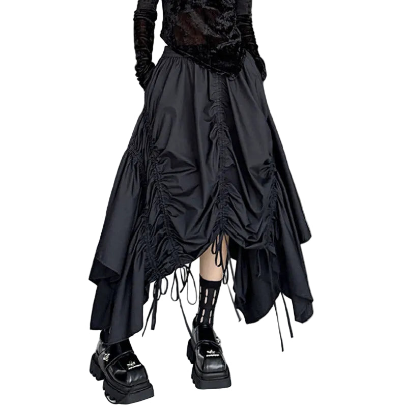 Designed for those who move with confidence, this skirt blends dramatic asymmetrical layering with a deep black gothic aesthetic that instantly elevates your presence. The flowing structure creates natural movement, making every step feel expressive and intentional.