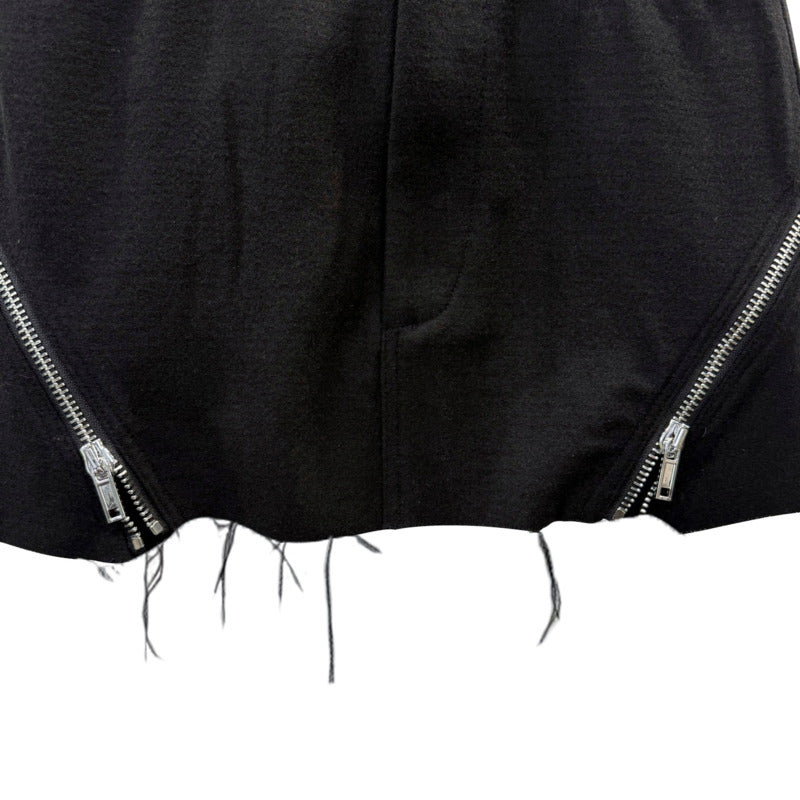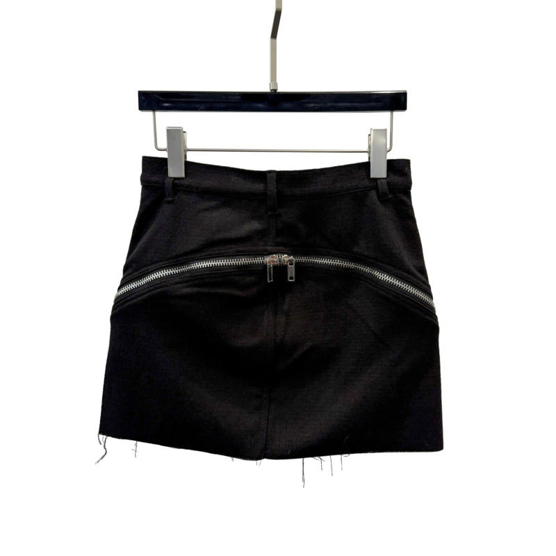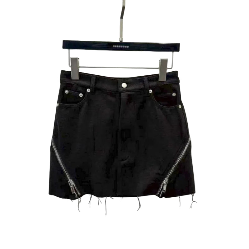The zippered accents introduce a sharp industrial contrast, allowing you to control the vibe — subtle or striking. A raw-cut hem finish enhances the underground aesthetic, giving the skirt a deliberately distressed character.