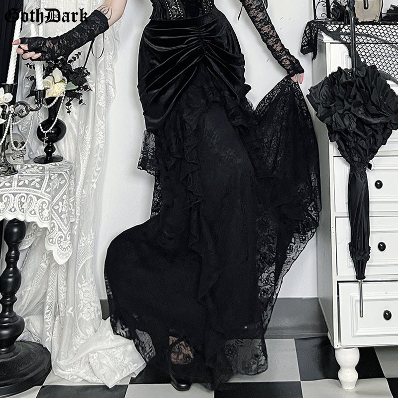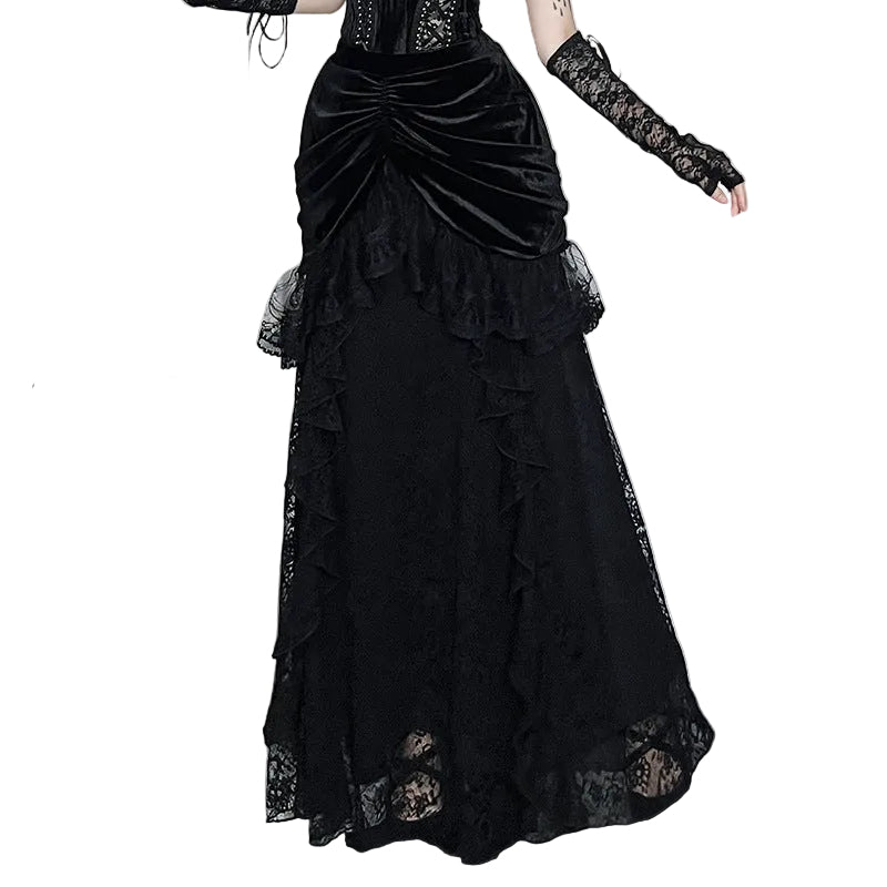 Crafted with a high-waisted flattering cut, the skirt naturally elongates the figure while offering comfort and balance. The deep black gothic tone paired with layered lace details delivers depth, sophistication, and a powerful sense of individuality.