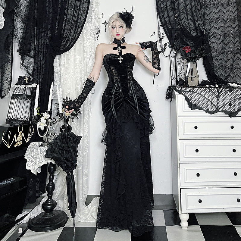 This design embodies dark romantic elegance, combining a full-length flowing silhouette with rich textures that move gracefully with every step. The soft drape enhances presence while creating a mysterious, refined visual impact ideal for gothic and alternative styling.