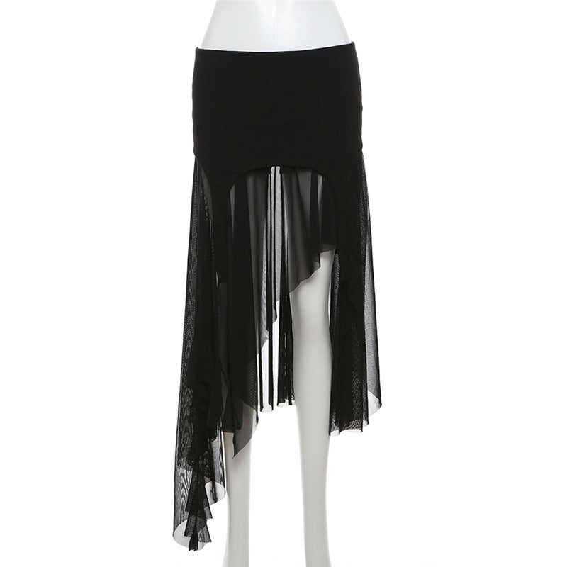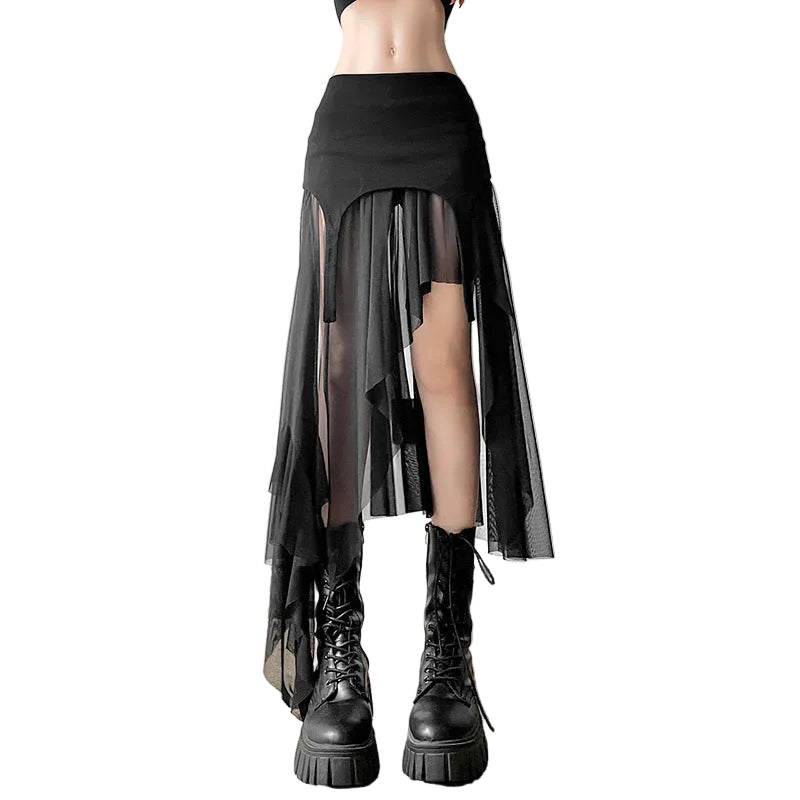 Designed to flow with your body, this piece blends sheer layered fabric with a structured high-waist fit, creating a silhouette that feels both mysterious and powerful. The asymmetrical hem and semi-transparent drape add depth and motion with every step