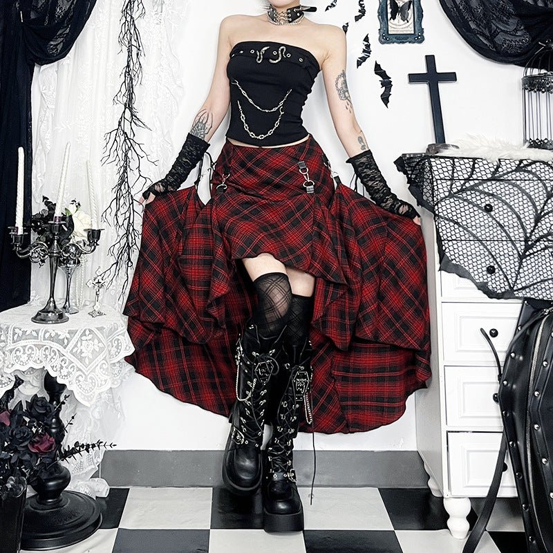 Designed for those who embrace contrast, this skirt blends red and black plaid with a dramatic silhouette that instantly commands attention. Every movement reveals a layered flow that feels powerful, expressive, and unapologetically bold.