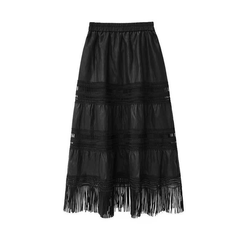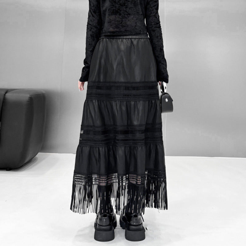 Delicate lace-inspired paneling and fringe accents elevate the design, transforming a classic goth skirt into a statement piece that commands attention