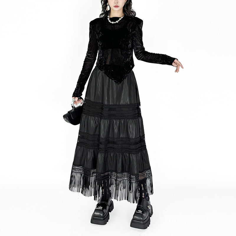 This skirt is designed for those who express power through dark elegance and fluid silhouettes. The long flowing cut creates a dramatic presence, while the layered construction adds depth and mystery with every step