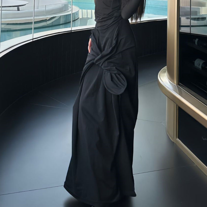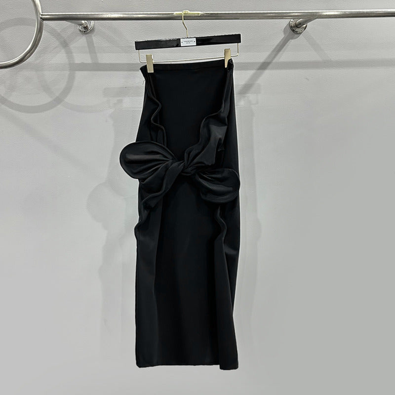 A striking sculptural bow detail creates visual depth while adding a couture-inspired edge. The deep black tone absorbs light beautifully, making it effortless to pair with corsets, mesh tops, or statement boots.