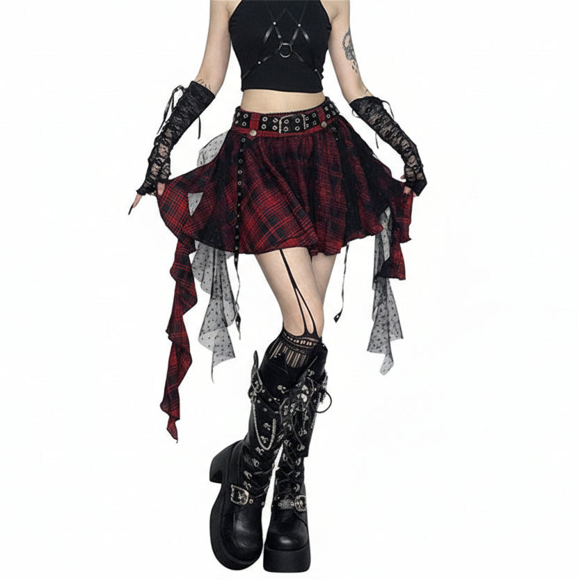 This design ignites confidence through a bold mix of red plaid gothic pattern and a dynamic asymmetrical mini silhouette, creating instant visual impact. The layered textures and flowing panels amplify movement, turning every step into a statement.
