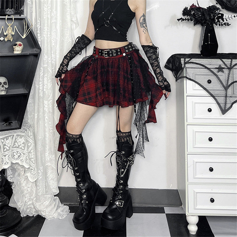 Built with a high-waisted structured waistband, the skirt defines the waist while staying comfortable and secure. The contrast of mesh overlay detailing against rich plaid fabric adds depth and attitude, balancing rebellion with refined gothic style.