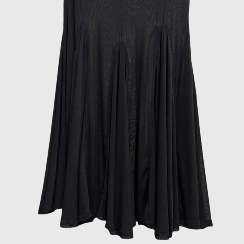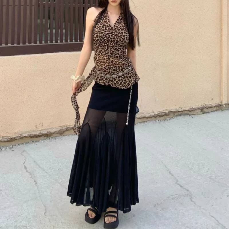 Designed to move with you, this piece blends dark gothic sensuality with a flowing maxi silhouette that instantly elevates your presence. The contrast between the opaque upper fit and sheer lower panels creates a captivating visual rhythm.
