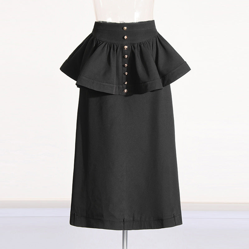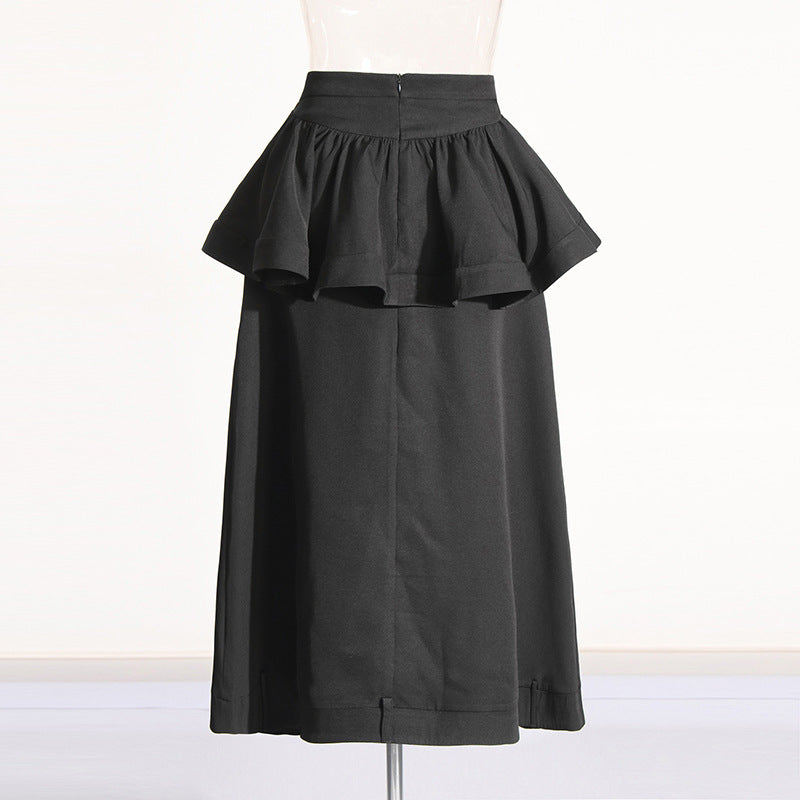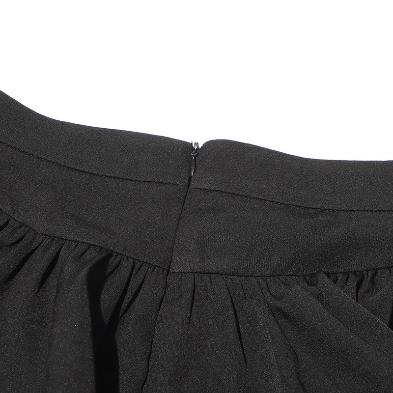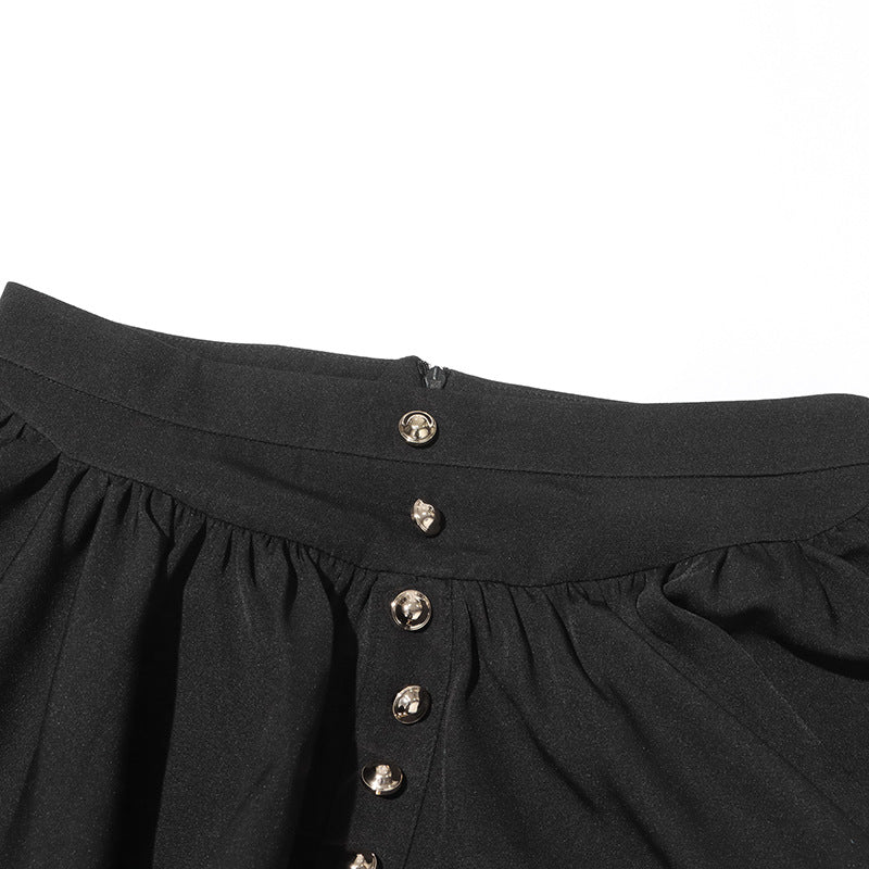 This skirt blends structured tailoring with fluid movement, creating a silhouette that feels confident, intentional, and endlessly wearable. The clean black tone anchors any gothic look while remaining refined enough for modern styling.