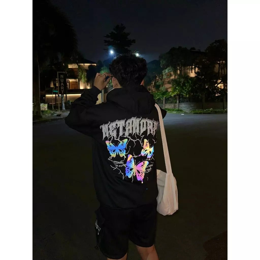 The Butterfly Cyberpunk Hoodie transforms your style with its oversize jumper fit and striking reflective print that glows when light hits. Designed as a unisex hoodie, it delivers both comfort and edgy streetwear appeal. ✨