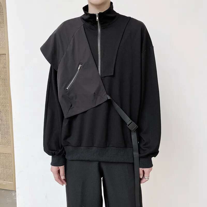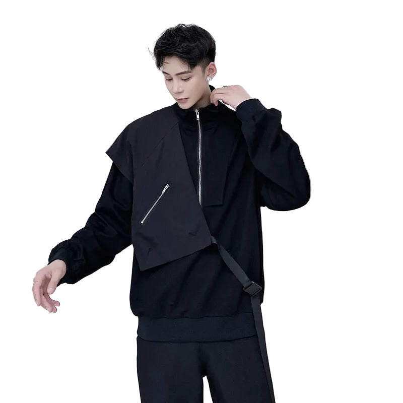 Feel the instant confidence boost that comes from wearing this architectural masterpiece. The main body features a comfortable, dark sweatshirt material, while the striking, asymmetric overlay panel creates the illusion of a vest or tactical shroud. This is effortless complexity at its best.