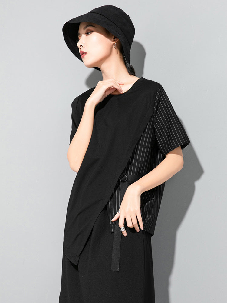 With its flowing asymmetrical cut and modern loose fit, this piece transforms a simple tee into a distinctive wardrobe essential. Perfect for pairing with skirts, techwear pants, or minimalist outfits, it effortlessly enhances your modern urban wardrobe.
