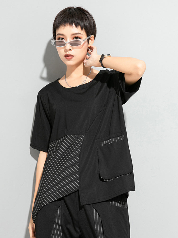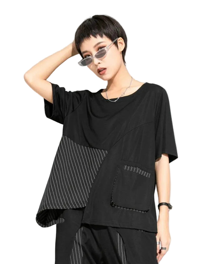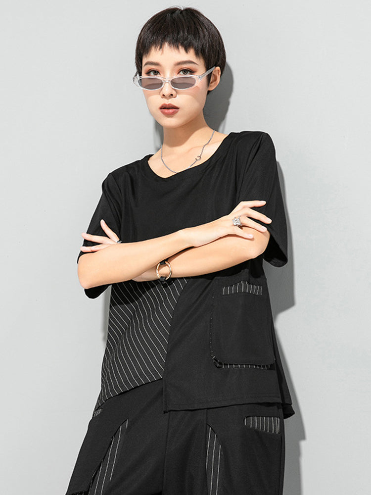The unique asymmetrical striped panel and contrast textured pocket create subtle visual depth while maintaining a refined monochrome minimalist look. Crafted from soft breathable fabric, it keeps you comfortable while enhancing a bold modern city style.