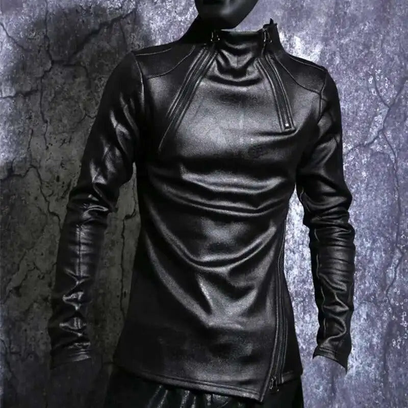 Unleash your inner rebel with the sleek and daring Black Faux Leather Cyberpunk Jacket. This statement piece combines a close-fitting silhouette with a high-collar design, making it perfect for those who want to stand out with style and attitude.