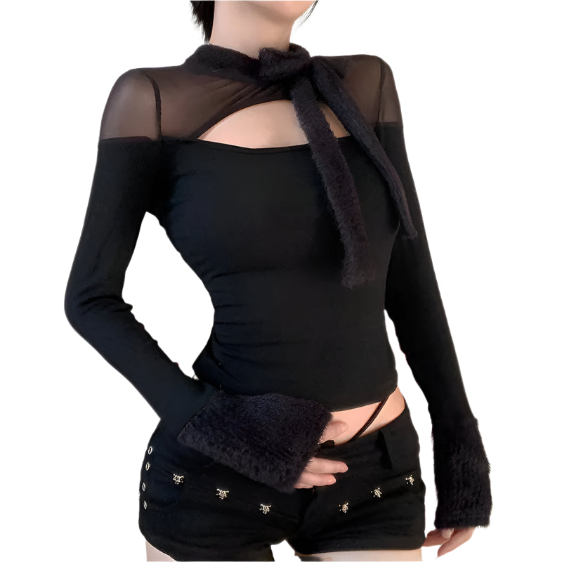 The unique mesh patchwork design and subtle hollow-out details give this top a modern, gothic-inspired twist. Pair it effortlessly with jeans, skirts, or layered under a jacket to showcase your personal style in any season.
