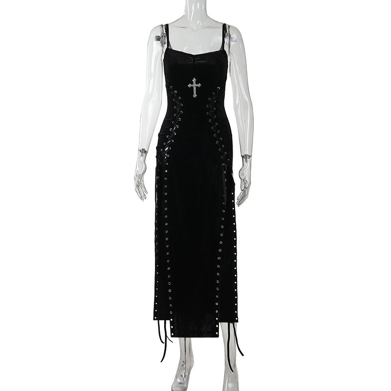 The deep black velvet texture creates a rich, alluring contrast against the skin, adding a touch of mystique and luxurious darkness. Side lace-up cutouts reveal just the right amount of edge, shaping a striking feminine silhouette that moves with fierce elegance.