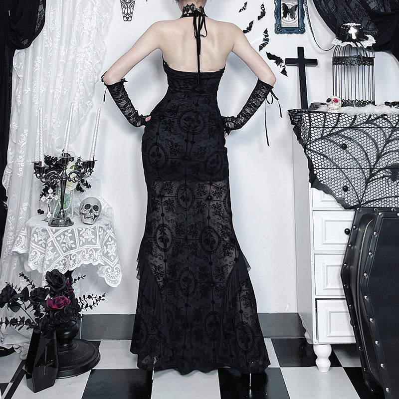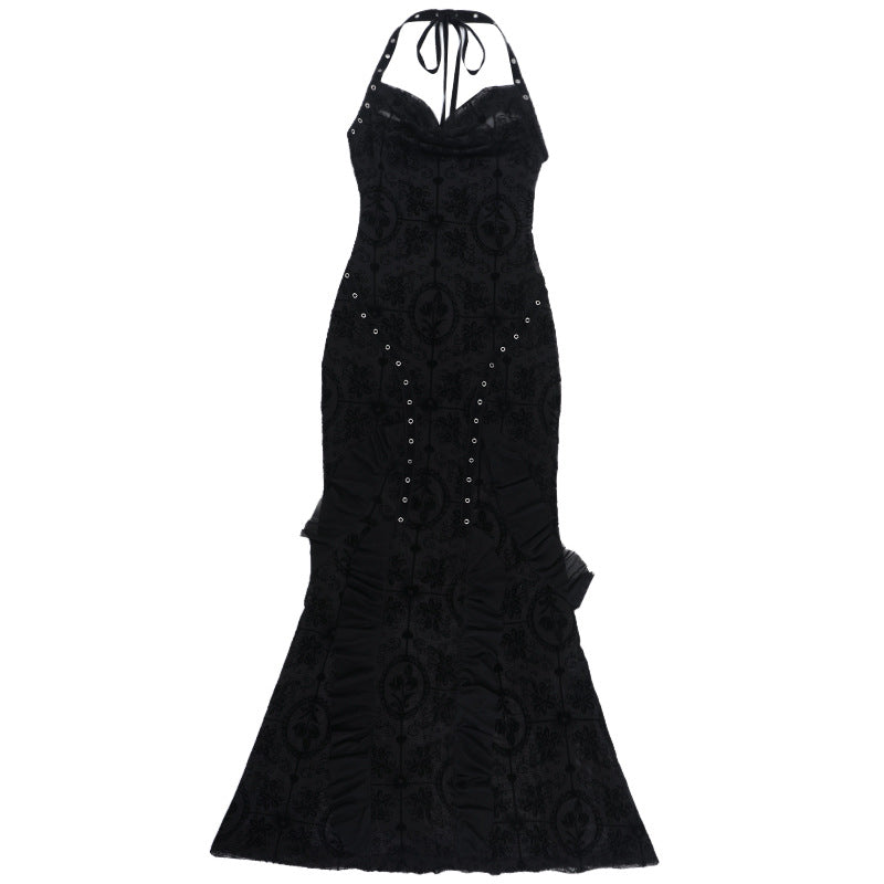 Step into a look that blends sensual elegance with dark sophistication, crafted to highlight your silhouette with magnetic confidence. The delicate velvet-burnout pattern adds depth and mystery, catching the light with every movement while staying true to a refined gothic aesthetic.