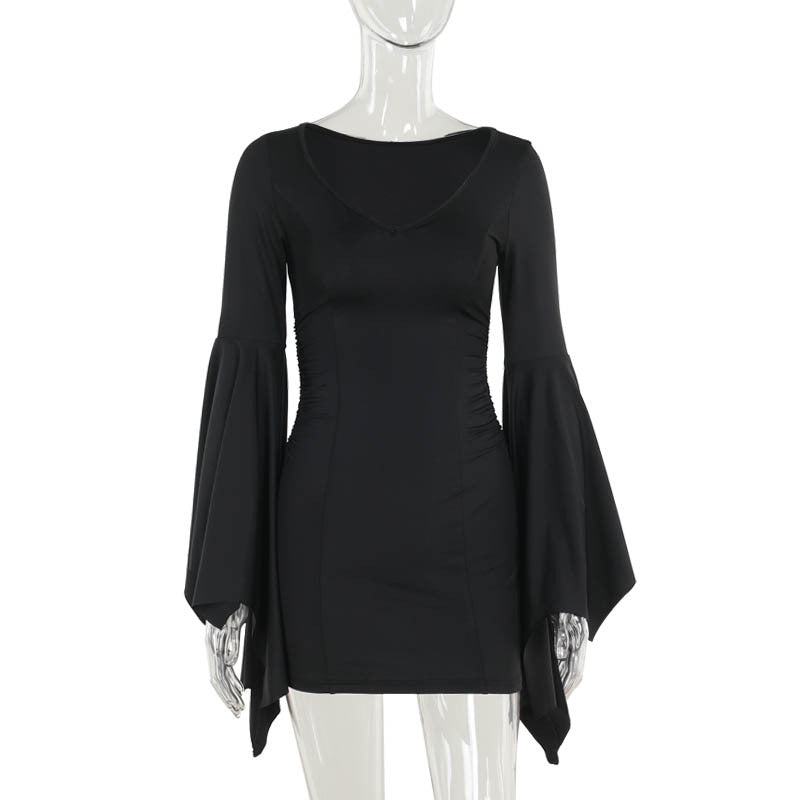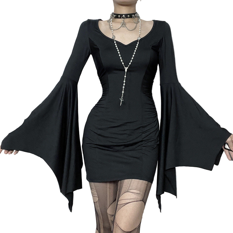 The deep-black tone enhances your presence instantly, while the sculpted waist and soft stretch fabric offer a naturally figure-flattering fit. Its dramatic bell sleeves create a breathtaking flow, adding a witchy gothic elegance that feels both timeless and empowering.