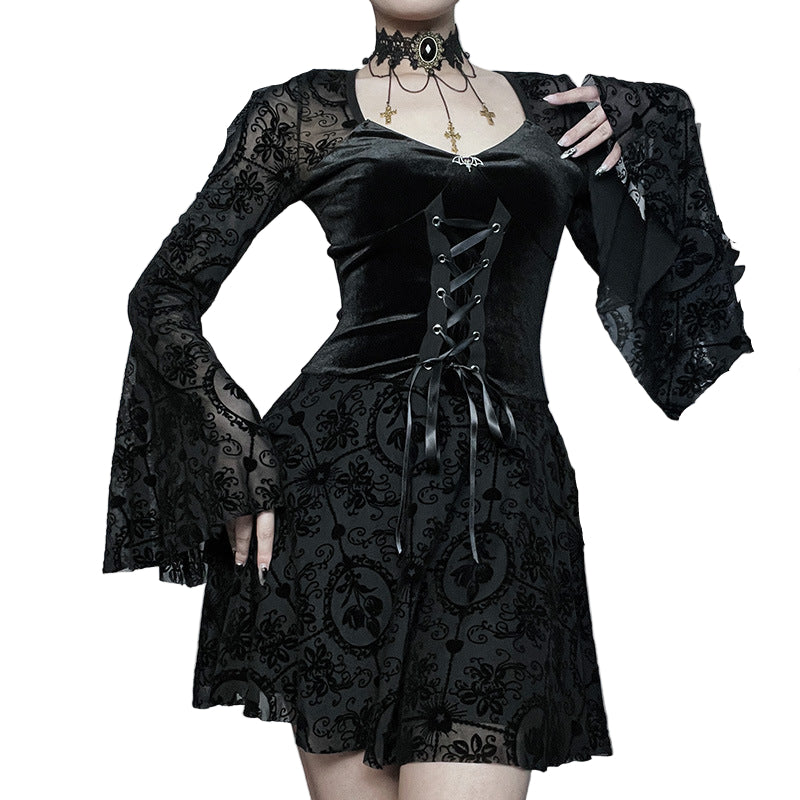 The corset-style front lacing sculpts your waist naturally, while the bell sleeves flow with dramatic movement that enhances every gesture. Smooth velvet meets patterned mesh, forming a soft, lightweight structure that feels comfortable from day to night.
