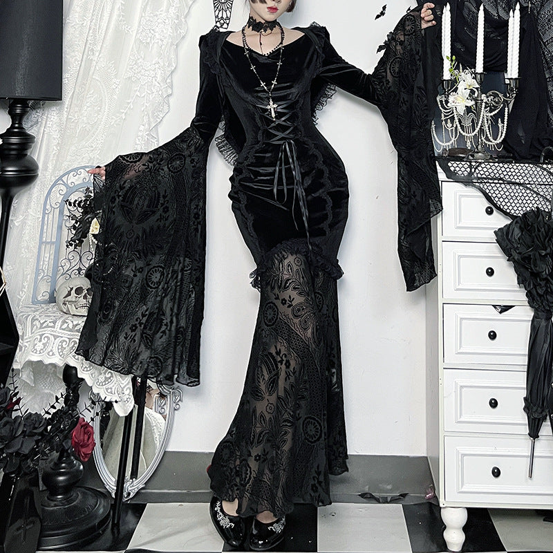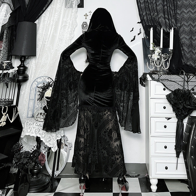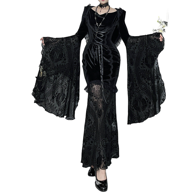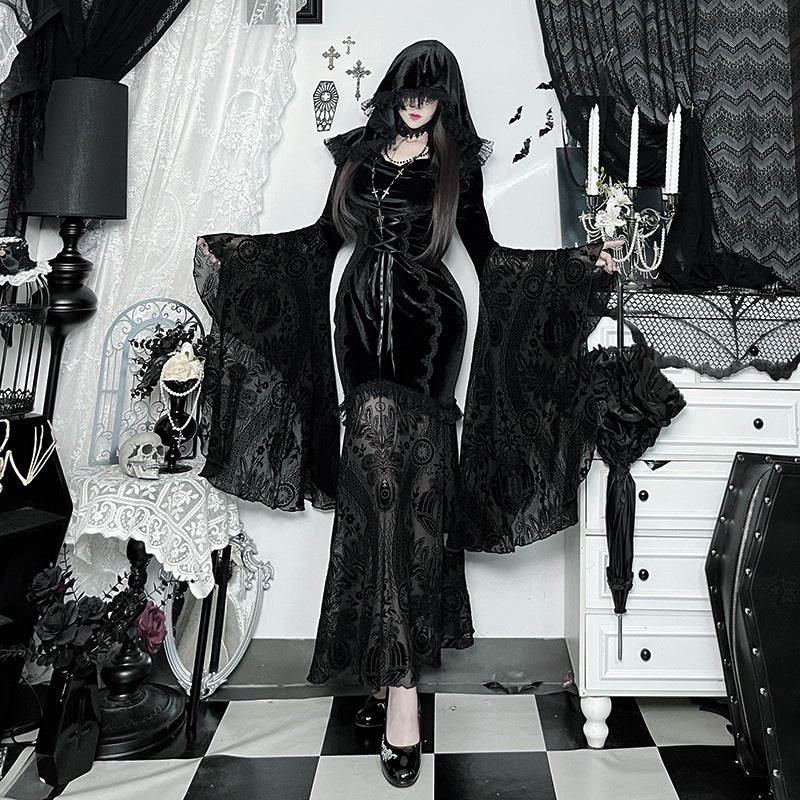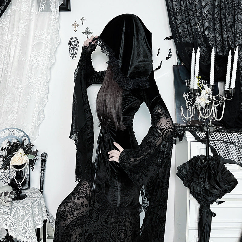 The dramatic hooded design adds a mysterious, ethereal touch that blends perfectly with gothic fashion aesthetics. Every movement becomes captivating thanks to the wide lace bell sleeves that flow with a spellbinding grace.