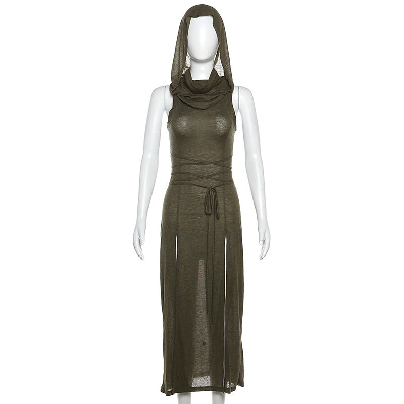 Crafted in a deep olive tone, the soft fabric drapes naturally over your shape, creating a look that is both feminine and futuristic. The dual front slits add fluid movement, giving every step a bold, cyberpunk-inspired presence.