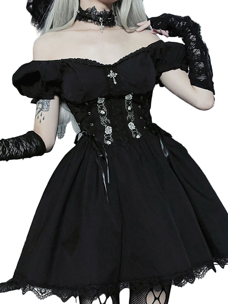 The off-shoulder puff sleeves create a dramatic and feminine contrast, while the embroidered corset panel cinches the waist beautifully. Each detail is designed to give you that empowering feeling of confidence—like slipping into your most irresistible self.
