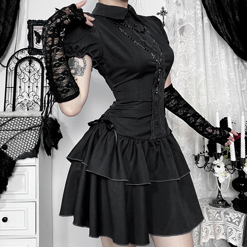 Step into the timeless elegance of dark fashion with a silhouette crafted to enhance your presence effortlessly. The structured puffed sleeves and refined Peter Pan collar bring a classic gothic charm that feels both nostalgic and irresistibly chic.