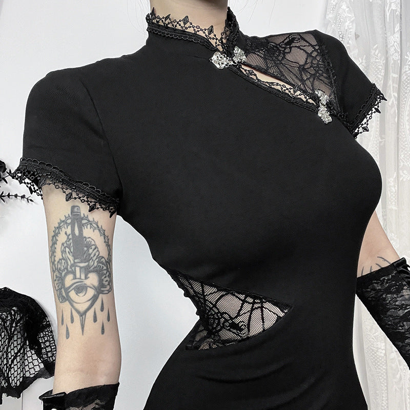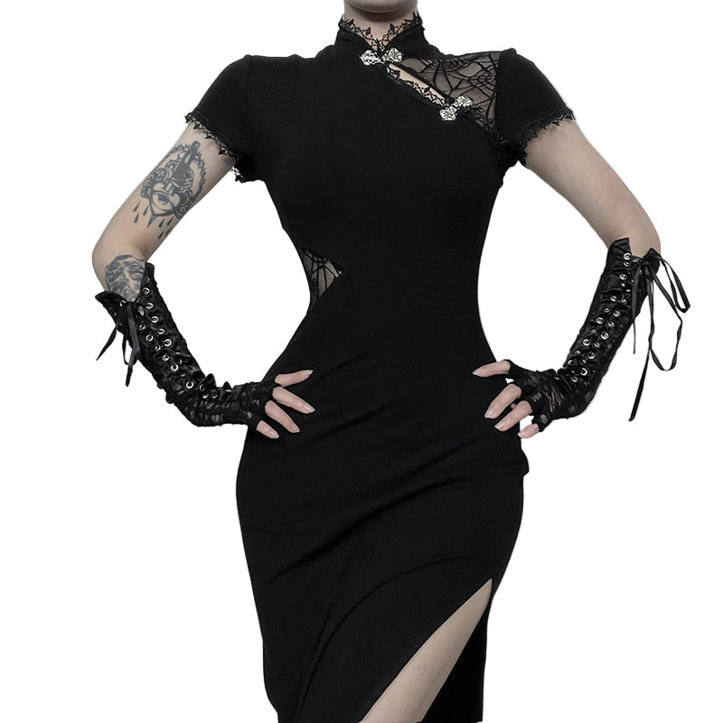 Designed for those who crave elegance with an intoxicating dark edge, this silhouette enhances your confidence with every step. The refined shape hugs your curves naturally, while the high neckline and lace mesh panels create a mysterious contrast that feels irresistibly gothic.