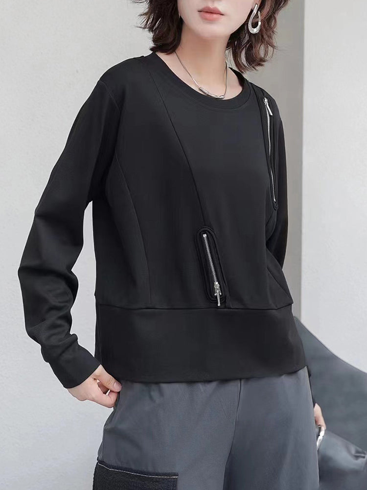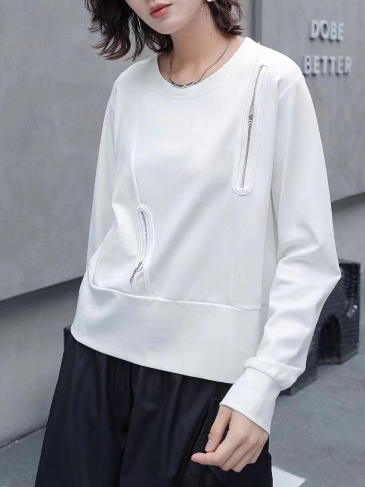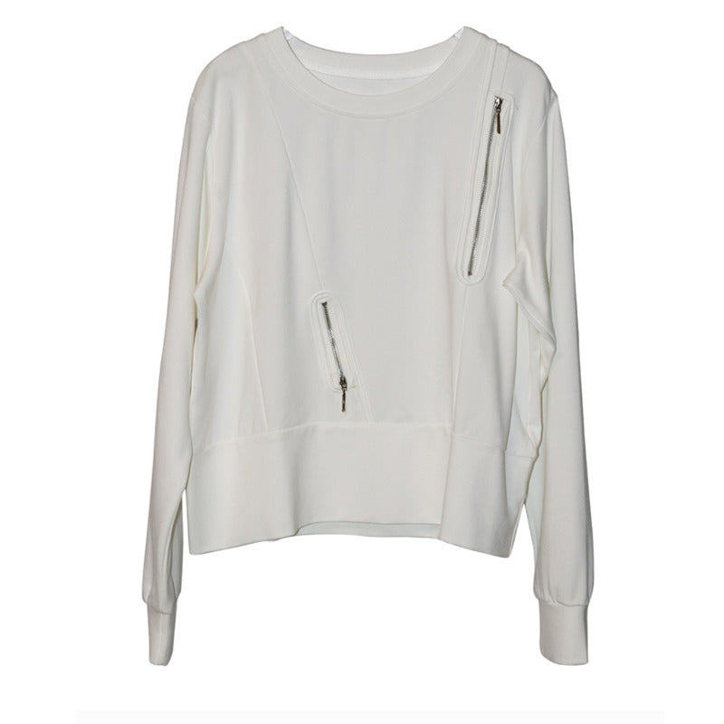 Distinctive vertical zipper accents add architectural interest while maintaining a refined look. The smooth structured fabric ensures the sweatshirt holds its shape, giving you a sleek finish from morning to evening.