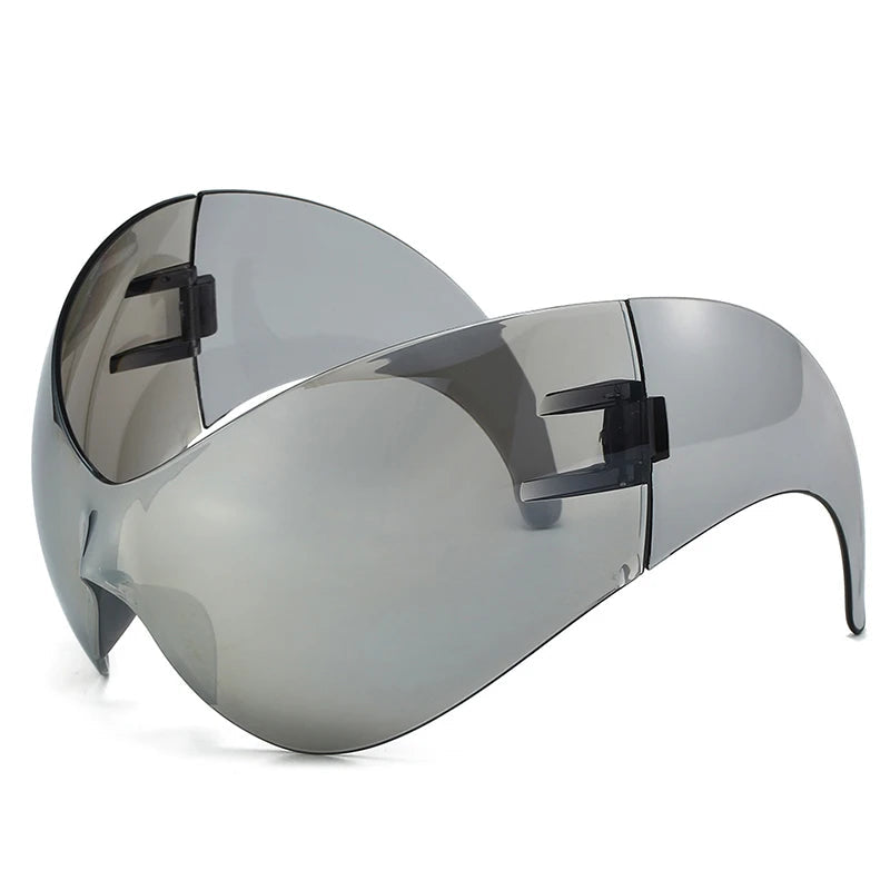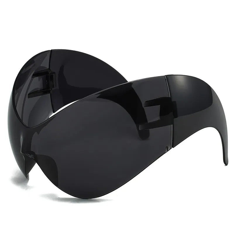 Designed with a full wraparound visor shape and sleek oversized frame, they embody the spirit of Y2K street style fused with futuristic minimalism. Whether you’re walking the city streets or shining under festival lights, these glasses ensure you stand out — effortlessly.
