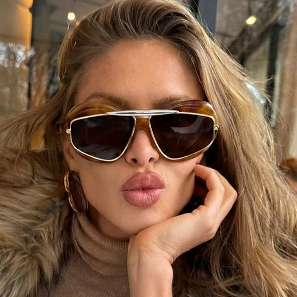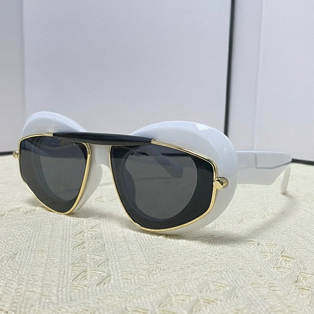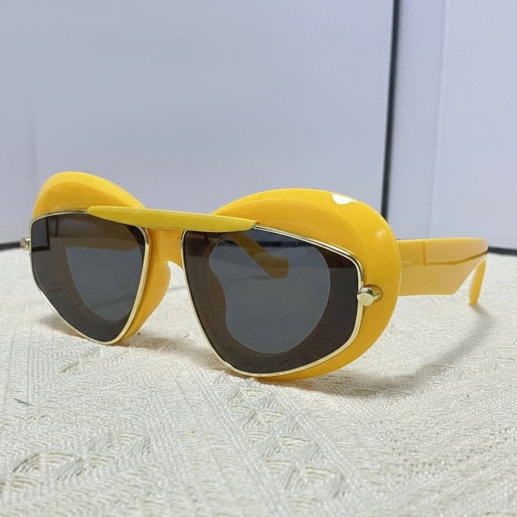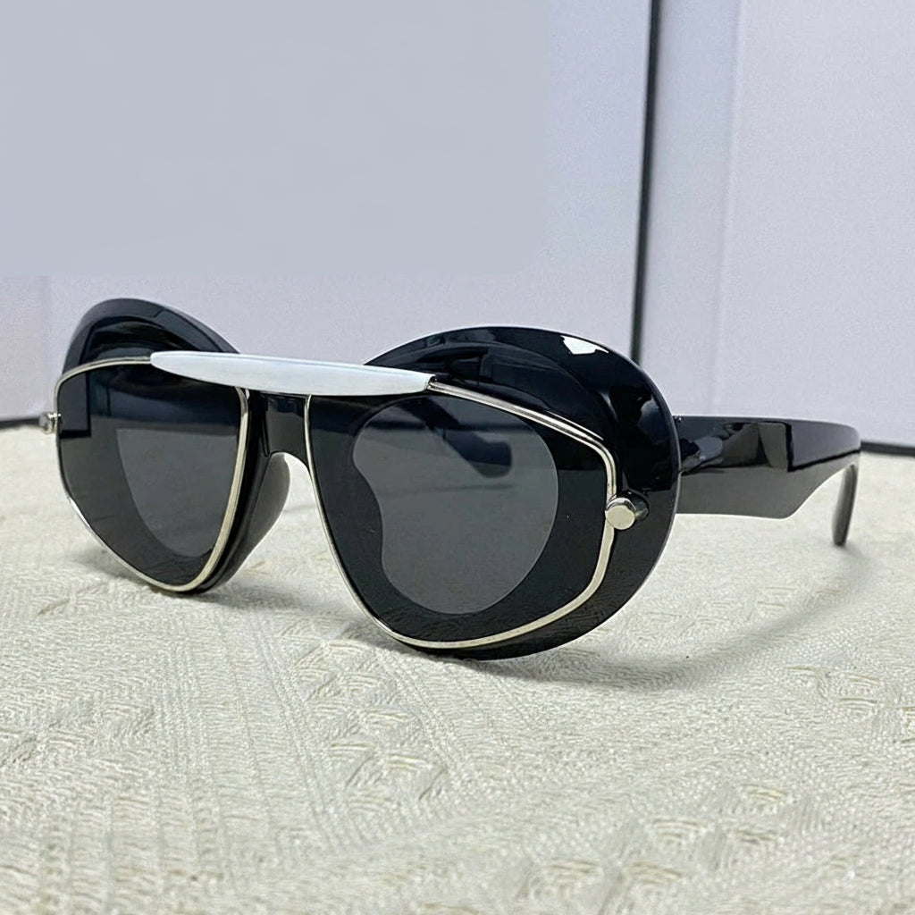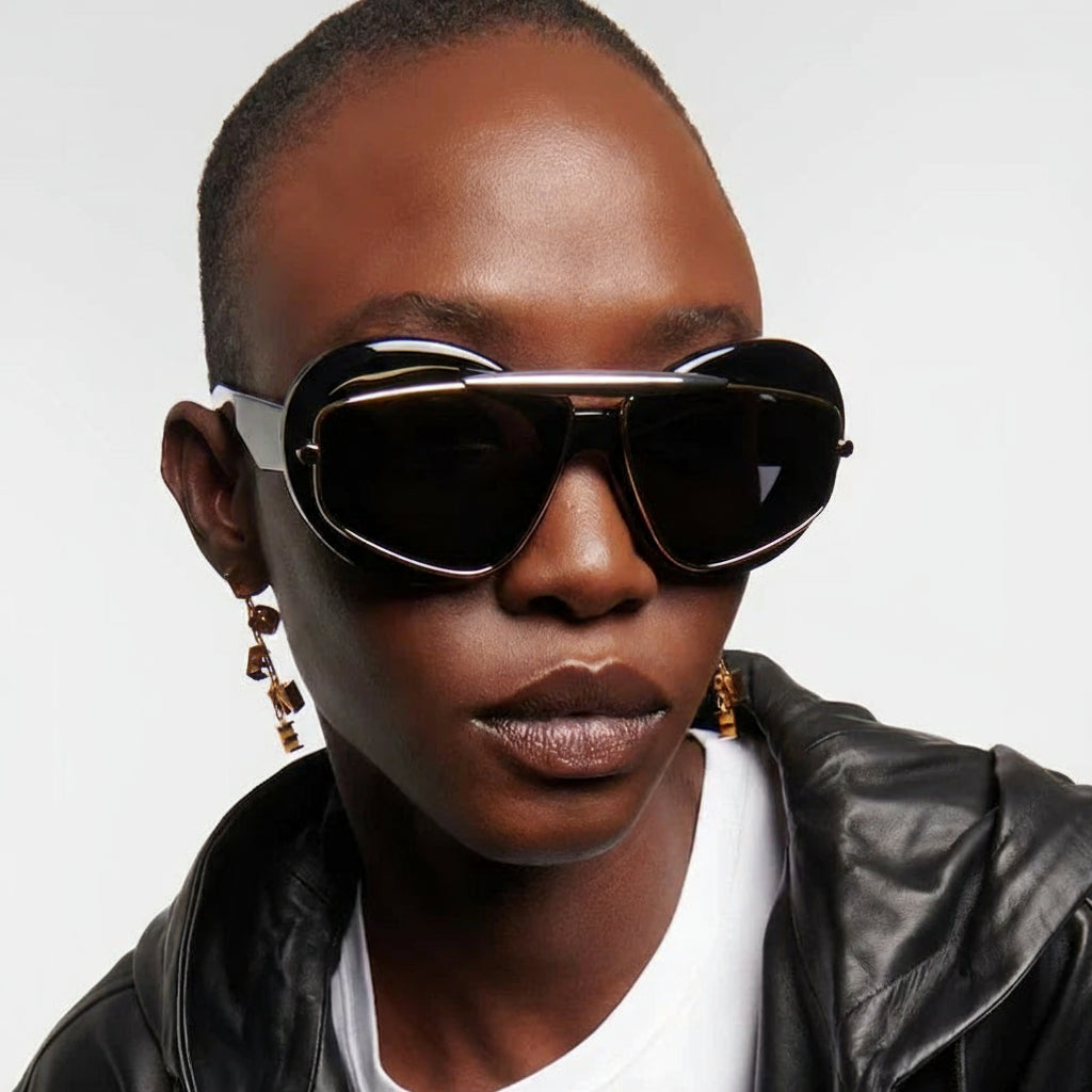 Their sculptural frame and metallic detailing create a perfect balance between nostalgic Y2K design and futuristic innovation. With their oversized lenses and avant-garde silhouette, these sunglasses transform every outfit into a fashion statement.
