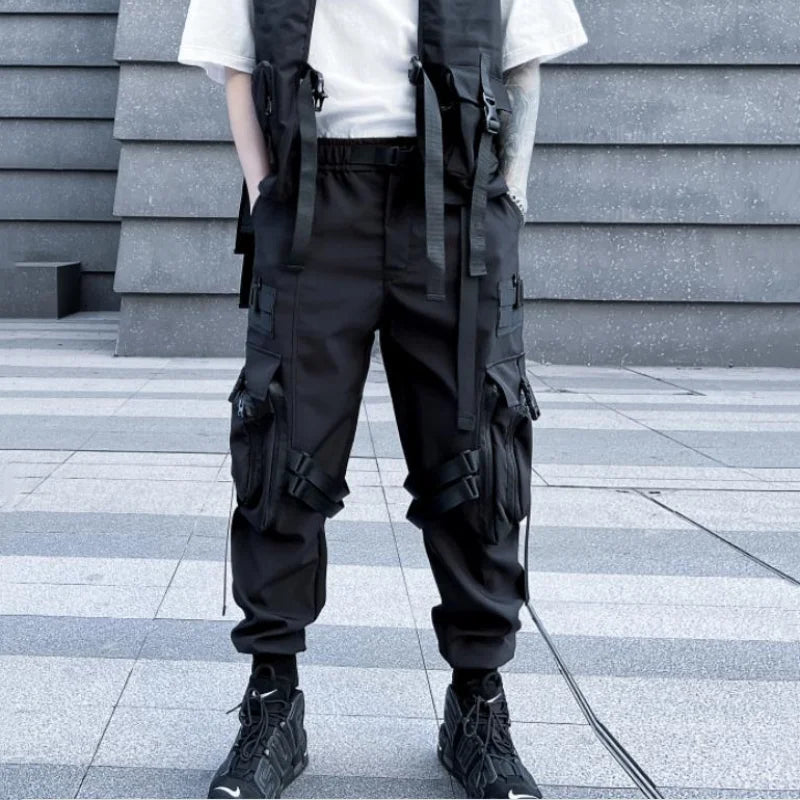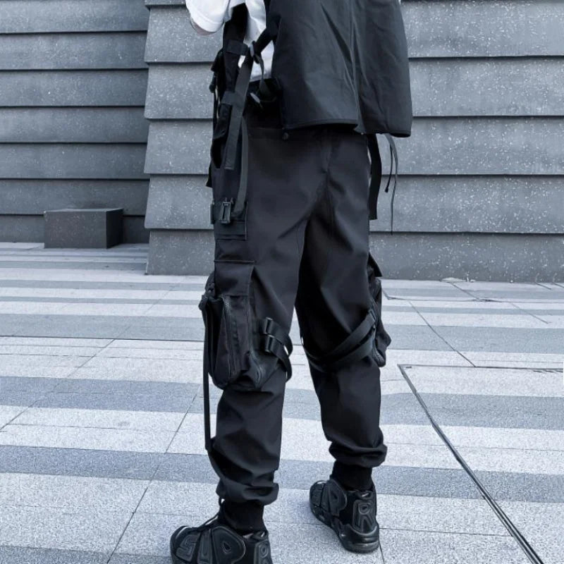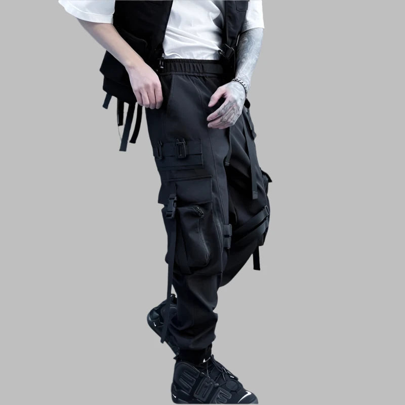 Pantalón negro vibrante con puños y múltiples bolsillos – Cyber Techwear Ir directamente al contenido