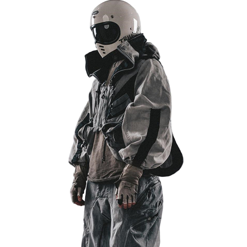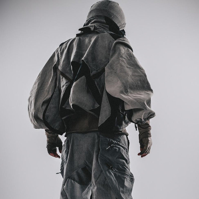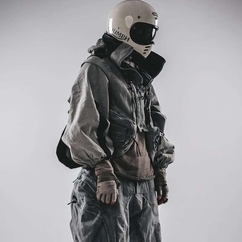 Confeccionada con materiales de alto rendimiento , ofrece comodidad y durabilidad para exploradores urbanos. Sus líneas asimétricas y su construcción en capas crean un ritmo visual futurista que captura la verdadera esencia de la moda urbana cyberpunk .
