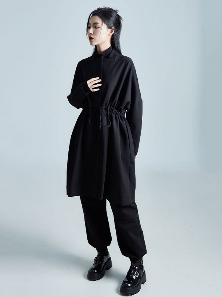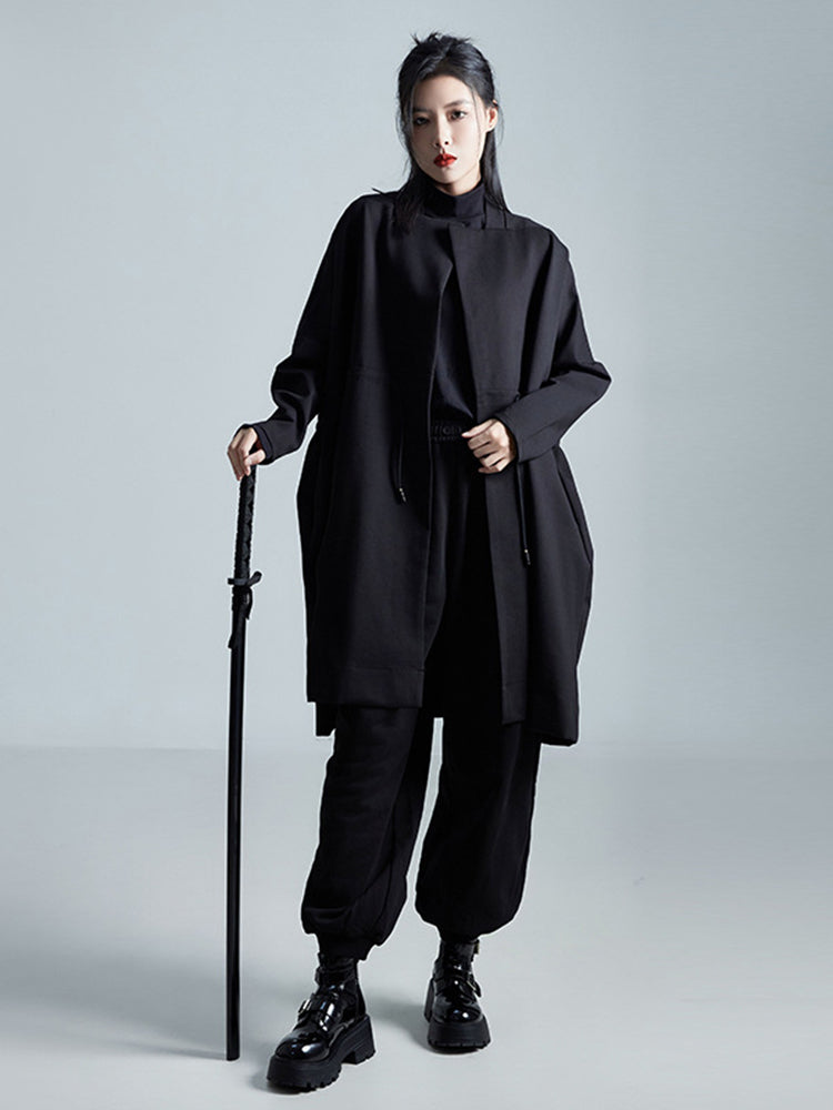 Diseñada para moverse con tranquilidad, esta chaqueta presenta un diseño minimalista en negro puro que transmite elegancia, serenidad y modernidad. Su corte largo y fluido crea una presencia visual impactante, a la vez que resulta muy cómoda de llevar.