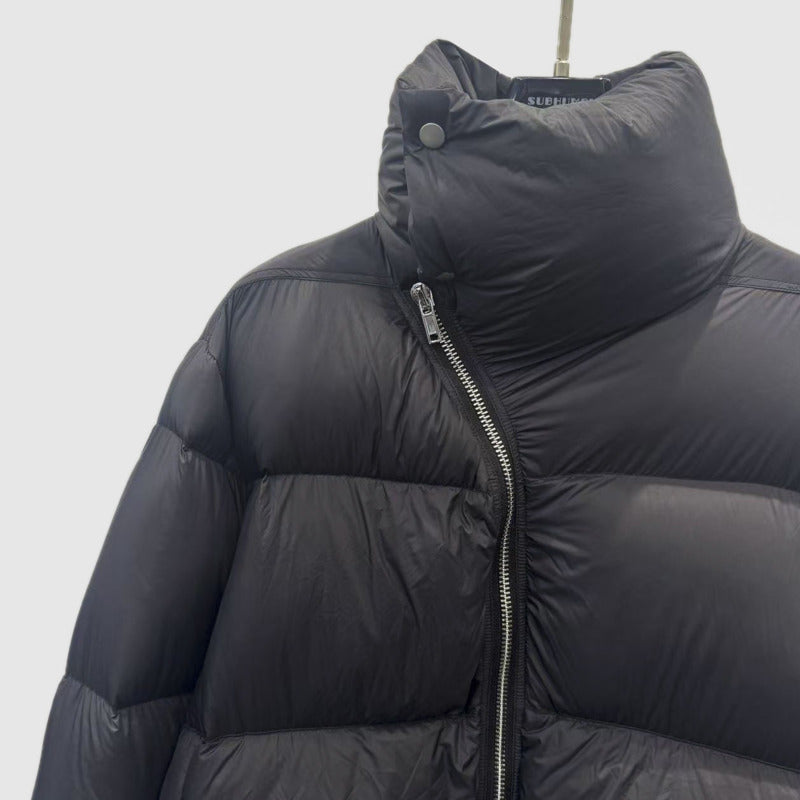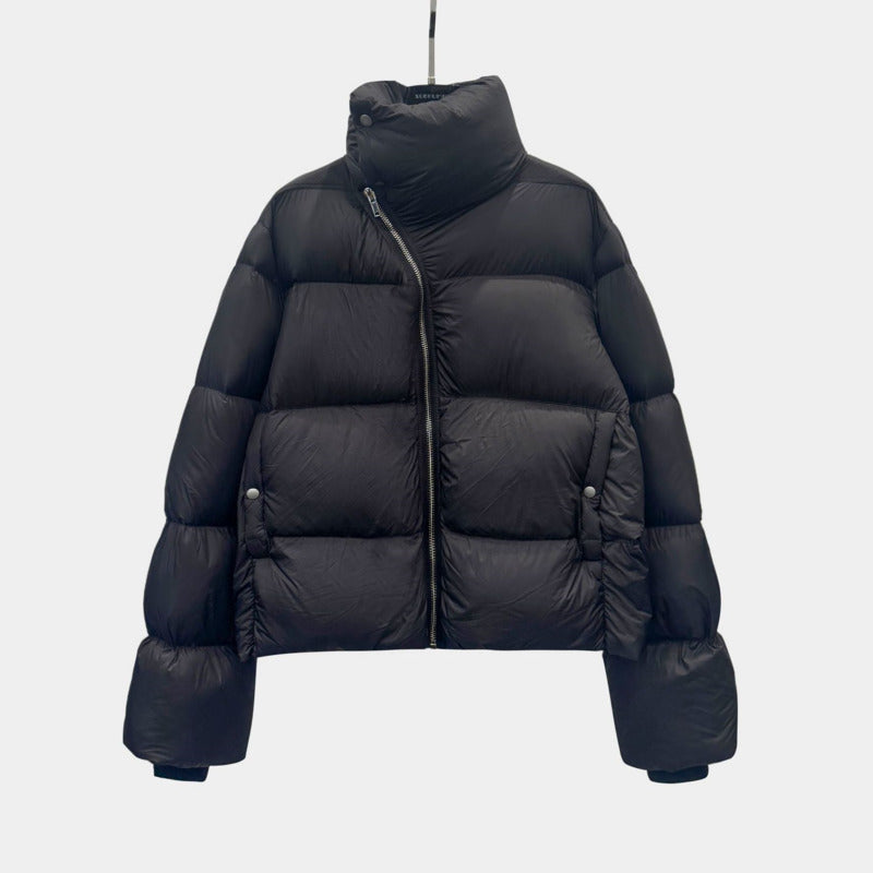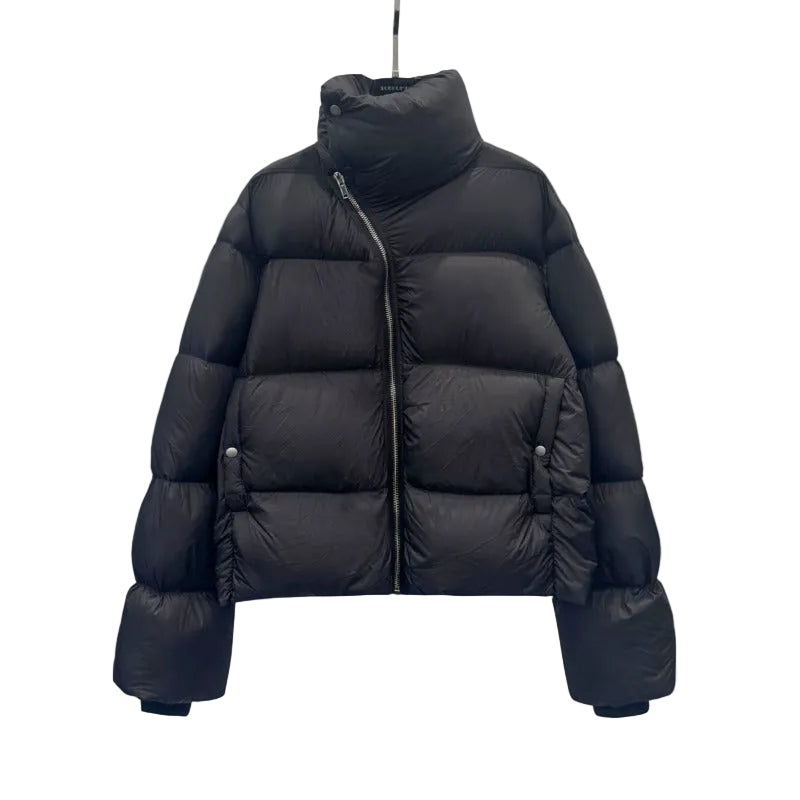 The high-neck padded collar shields you from wind and low temperatures, while the asymmetrical zip closure adds a bold visual edge that sets this piece apart. It’s warmth you can feel and style you can see.