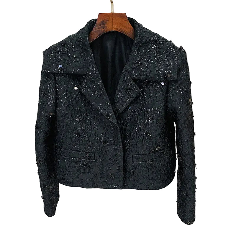 Crafted with a richly textured fabric, the surface is adorned with delicate sequins that subtly catch the light, adding depth without overwhelming your look. The black base keeps it timeless while elevating both evening and statement outfits.