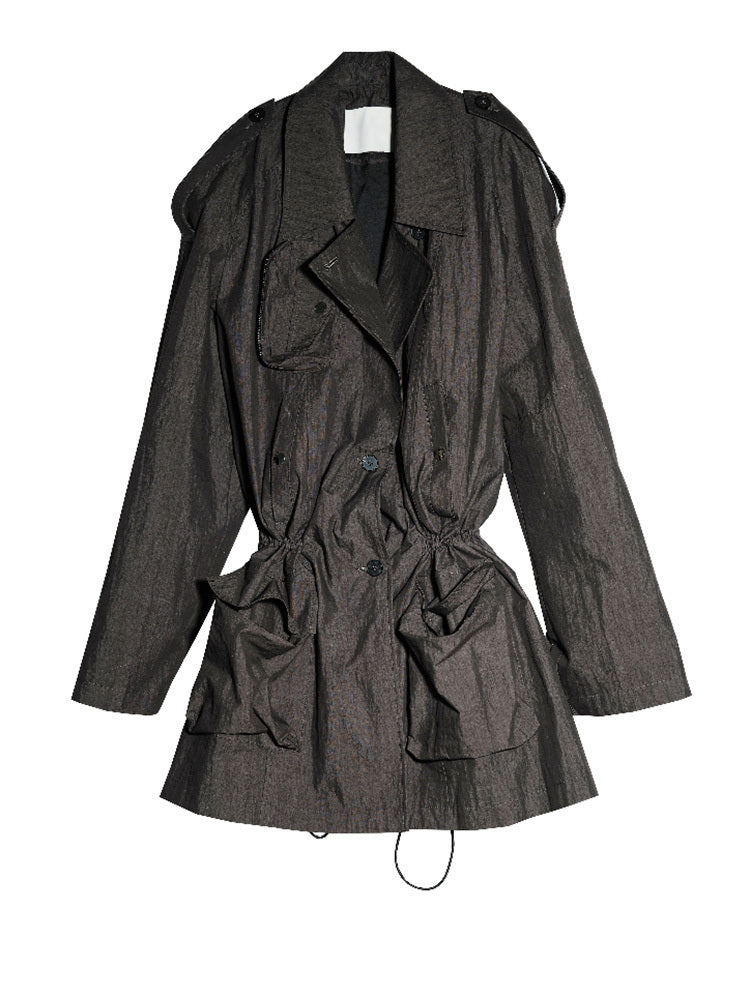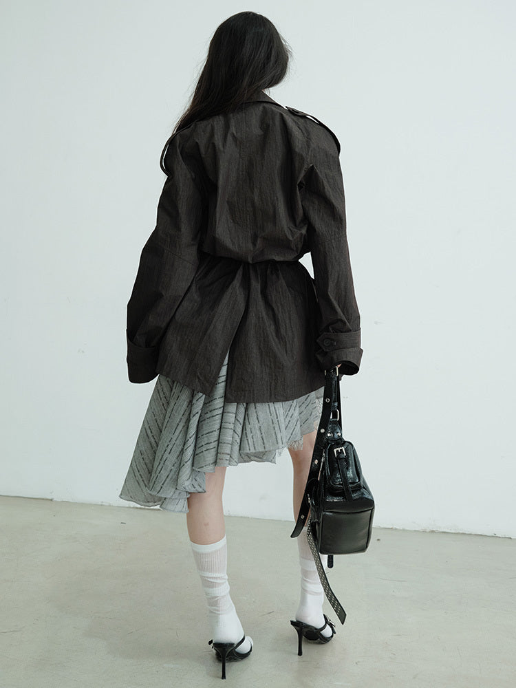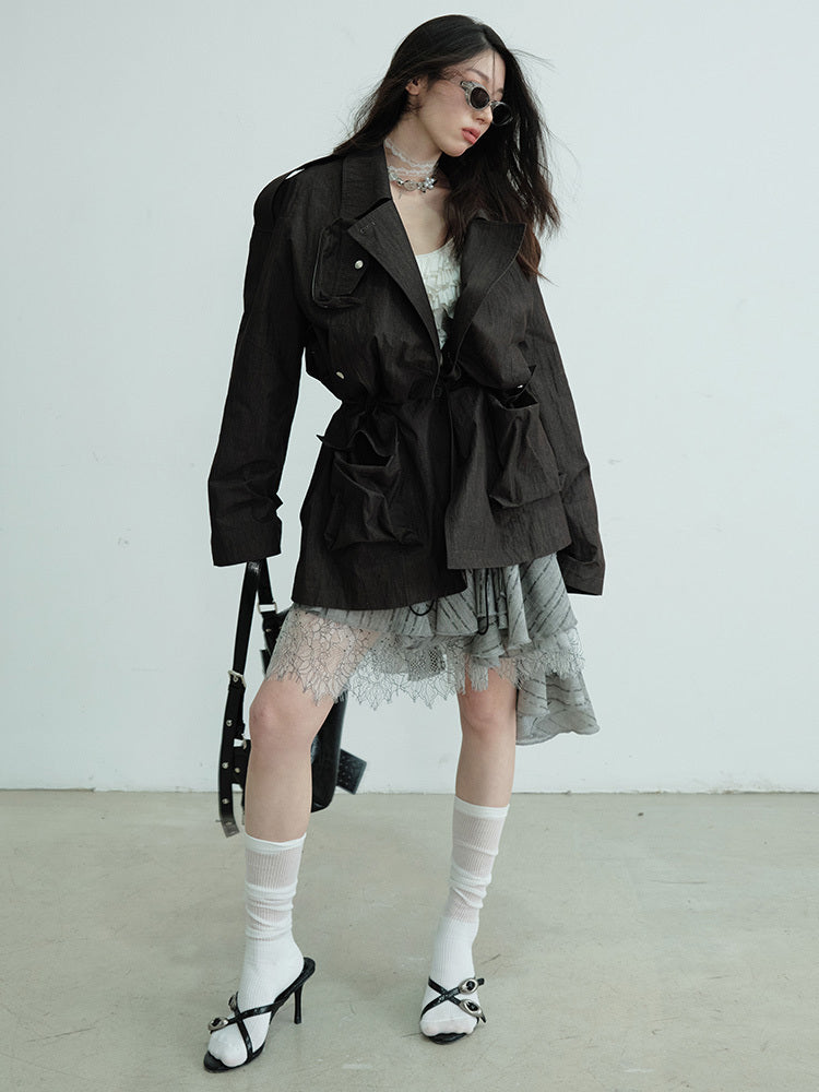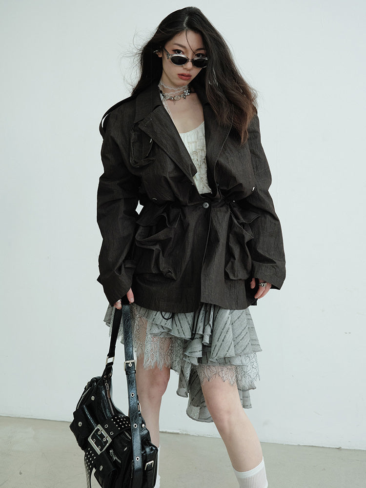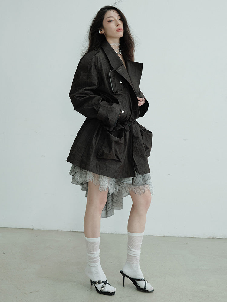 The oversized lapels and cinched waist come together to form a striking fashion-forward shape, giving you an instantly elevated presence. Every detail was crafted to guide the eye and subtly highlight your posture, making this jacket a true confidence piece.
