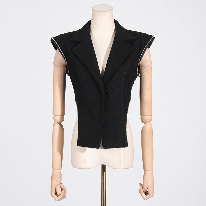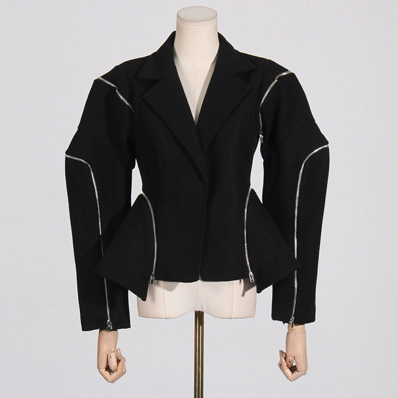 Precision zipper accents along the sleeves and sides introduce a subtle edge, allowing the jacket to move with you while maintaining its luxury evening aesthetic. The deep black tone reflects light beautifully, making it ideal for both formal nights and elevated dinners