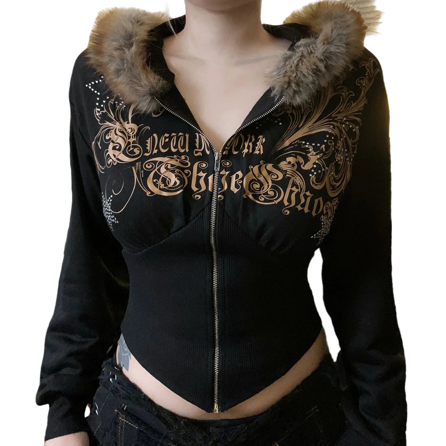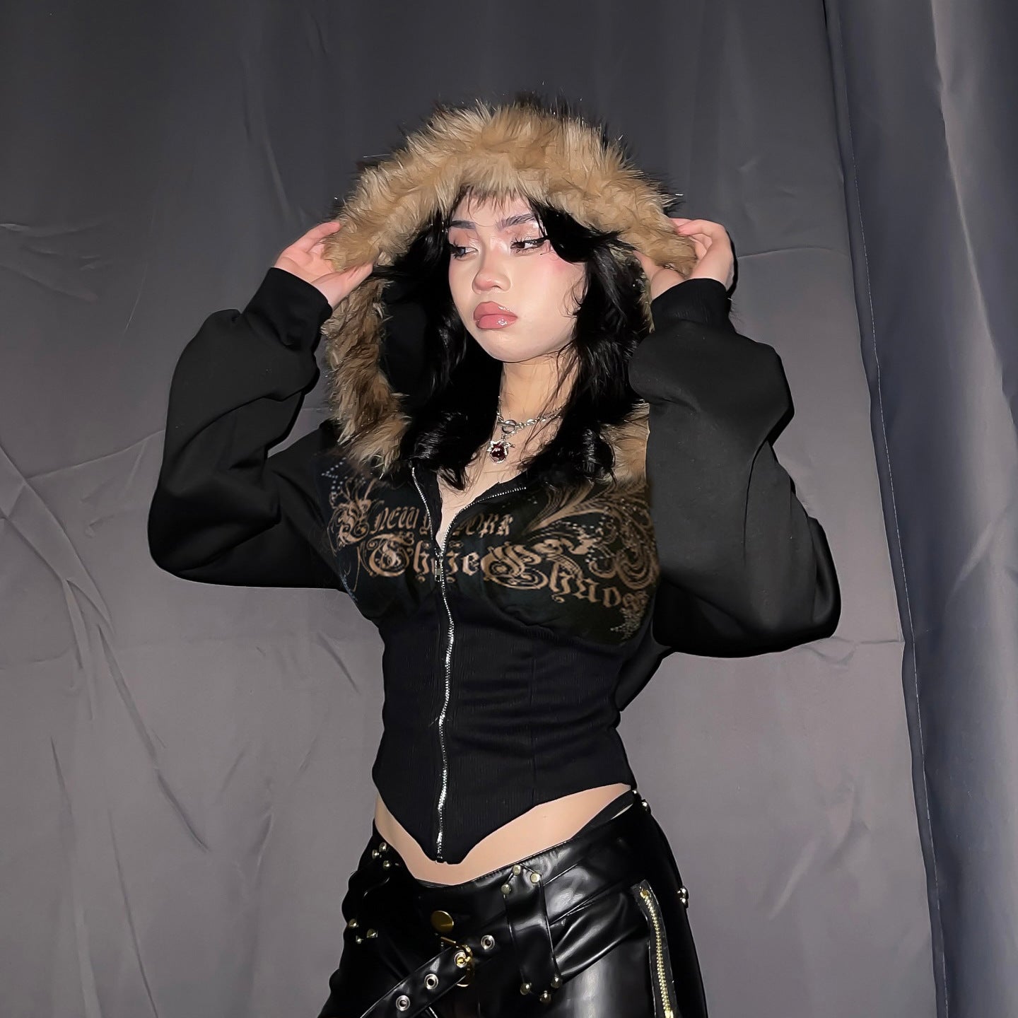 The soft hood with faux fur trim adds warmth while elevating the visual impact, framing the neckline beautifully. Its zip-up front closure allows easy layering, making it adaptable from casual days to bold streetwear nights