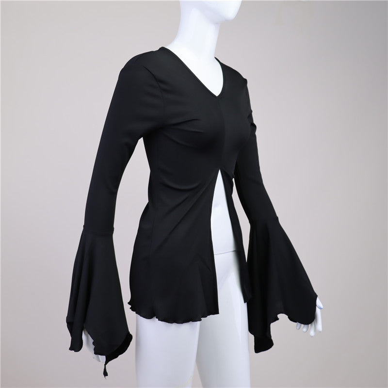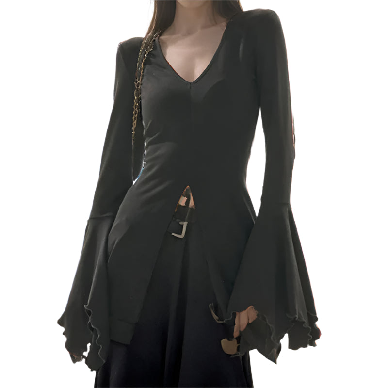 Realza tu estilo gótico con el top negro con cuello en V y mangas acampanadas . Perfecto para otoño e invierno , este top presenta un favorecedor diseño de cuello en V y mangas acampanadas que le dan un toque dramático a tu look. 🌙✨