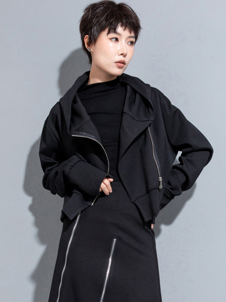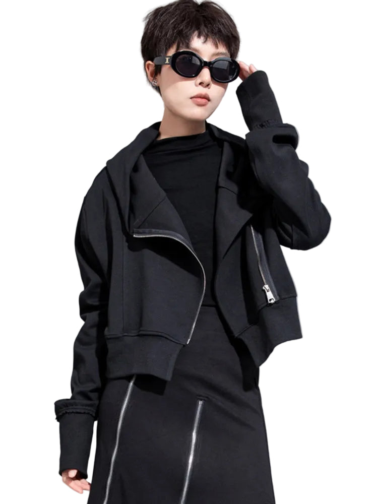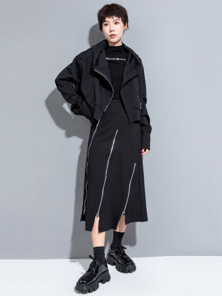 El largo corto realza la cintura y aporta estructura a conjuntos con capas. Su distintivo diseño asimétrico con cremallera aporta un toque visual innovador y permite un estilo flexible según tu estado de ánimo.
