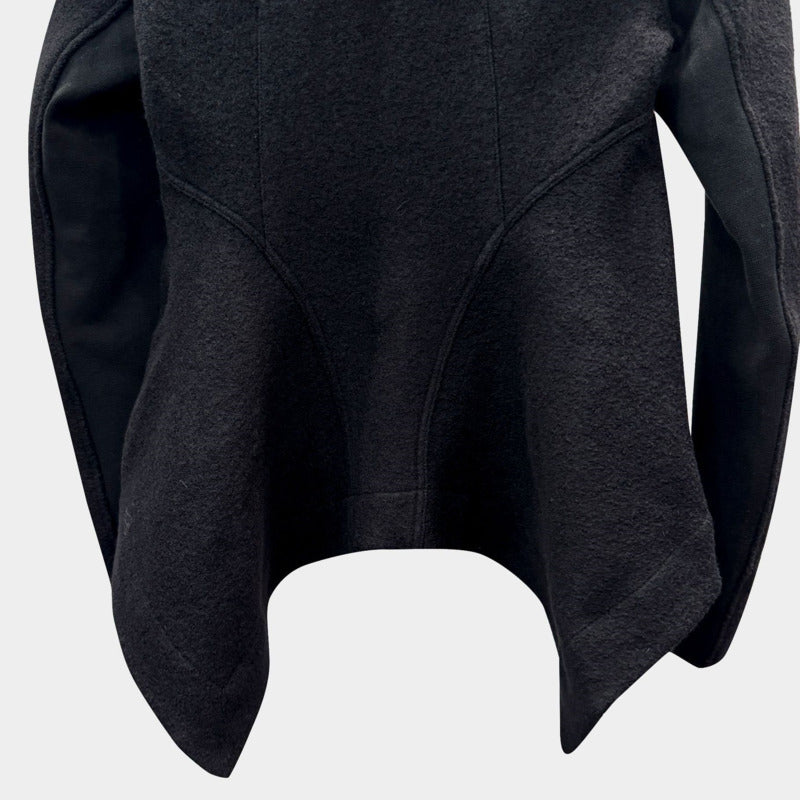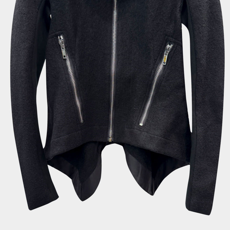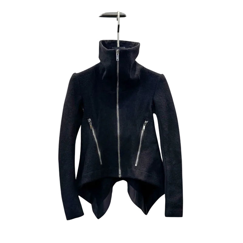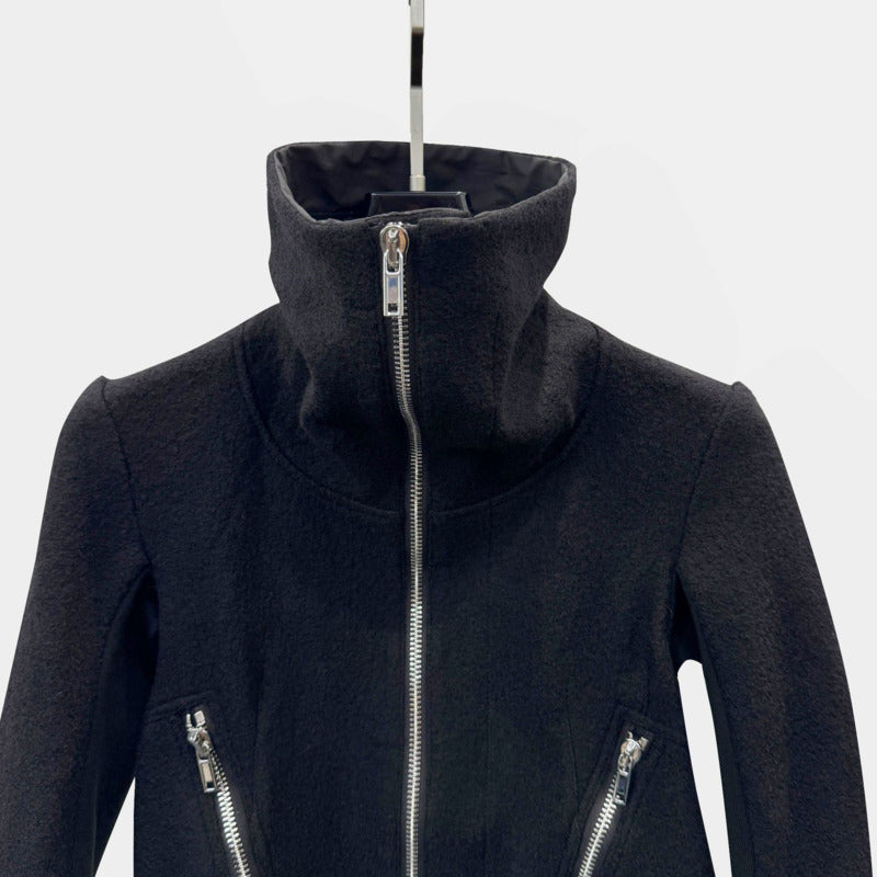 Crafted from structured black wool fabric, it delivers natural warmth while remaining breathable and comfortable. The high collar with full zip closure frames the neckline beautifully, giving you protection from the cold and a sharp, modern edge.
