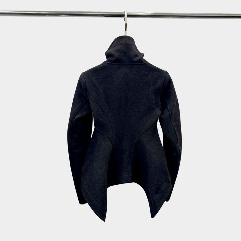 This jacket immediately communicates refined strength and architectural femininity. Its sculpted silhouette and asymmetrical hem create a striking visual flow that makes you feel powerful, confident, and effortlessly polished.