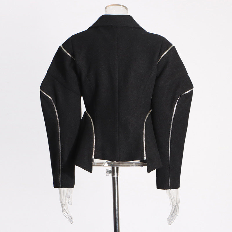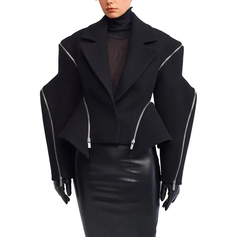 The deep black tone offers timeless versatility, while the long sleeves provide a balanced, elongated look that flatters the arms and shoulders. Subtle zipper accents add a contemporary edge without overwhelming the minimalist aesthetic.