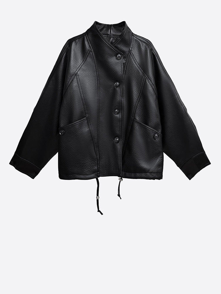 Diseñada para causar una gran impresión, esta chaqueta presenta un acabado de cuero sintético negro intenso con una sutil textura granulada que realza al instante los looks urbanos modernos. Su presencia se siente poderosa, refinada y con una seguridad sin complejos.