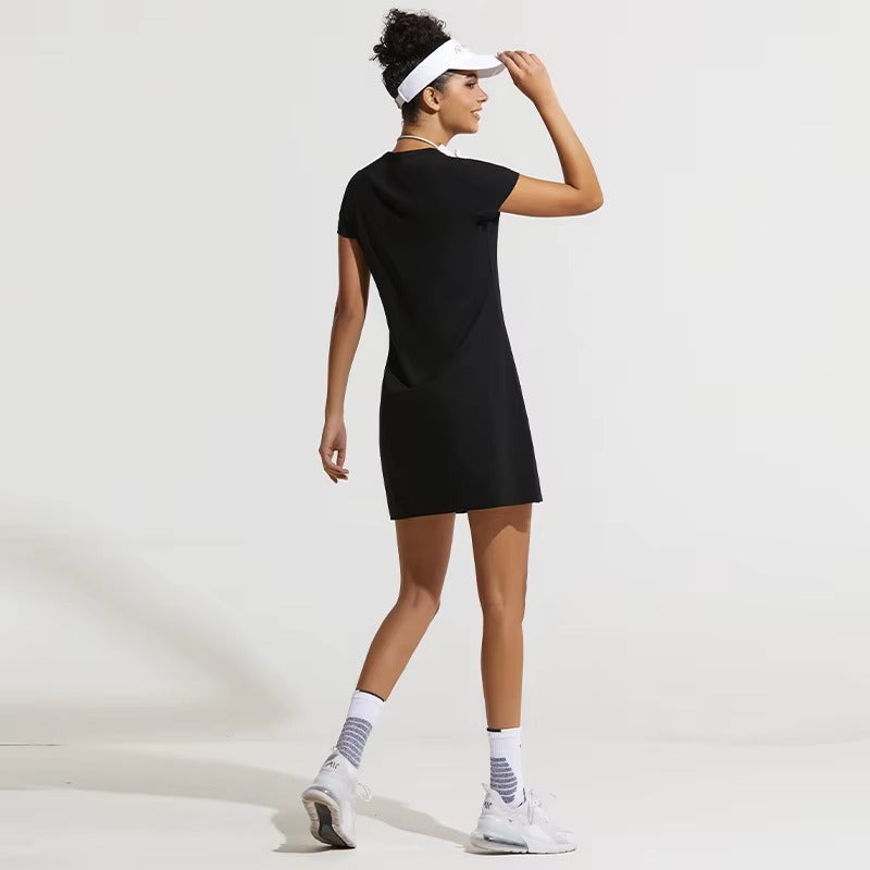 Con una silueta elegante y un tejido suave y elástico, está diseñado para ceñirse a tu cuerpo sin restricciones. Con shorts incorporados y sutiles aberturas laterales, este vestido falda pantalón te permite moverte con fuerza y gracia. 🖤