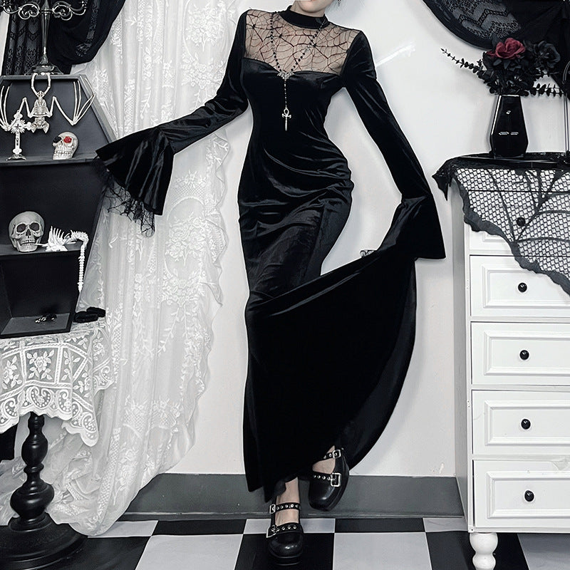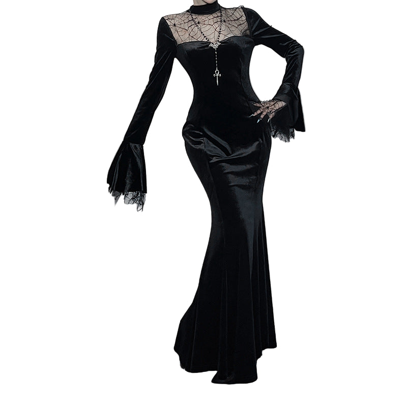 Su exclusivo tejido de terciopelo refleja la luz con delicadeza, creando un profundo brillo negro que realza cada movimiento. El escote de encaje transparente con diseño de telaraña añade un contraste impactante, atrayendo la atención hacia tu postura y presencia. Diseñado para armonizar con la estética gótica moderna, este vestido te garantiza destacar dondequiera que vayas.